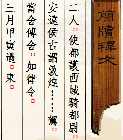 木简1枚(出土编号:Ⅱ90DXT0213③:135),1990年出土于敦煌悬泉置遗址。长7.2、宽1.3、厚0.25厘米。木简上残,两行书写,字迹模糊,难以辨识。简文作“二人。使都护西域骑都尉、安远侯吉谓敦煌……驾,当舍传舍,如律令。三月甲寅过,东。”。简中“使都护西域骑都尉”是西域都护的正式官名,“骑都尉”当指以本官都护西域,是其本职,而“使”则突出了使职性质。这是悬泉置记录的一份传文书,简文不完整,大意是说某年三月甲寅日,西域都护郑吉派遣的使者自西向东行,悬泉置依传律规定,为停驻的两名使者提供了饮食。该简文对研究悬泉置的传舍制度,以及西汉王朝对西域行使管辖提供了重要的原始资料。现藏凯发k8简牍博物馆。
