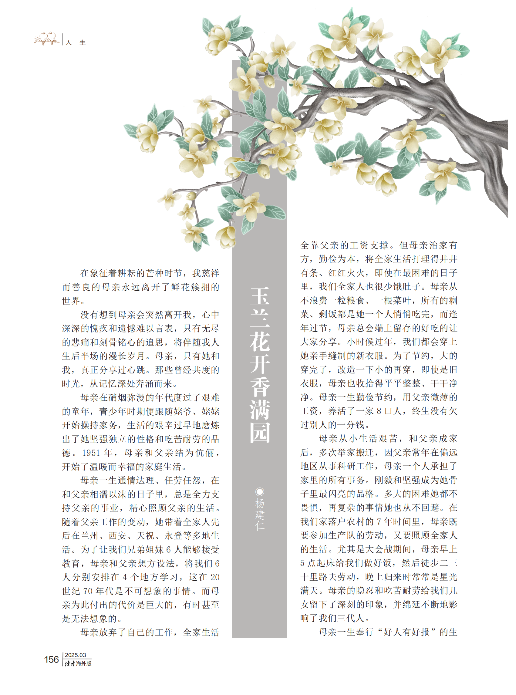 如果生命是一树花开,母亲便是一朵最灿烂、最耀眼的玉兰,虽然花朵凋谢,落英缤纷,但枝干苍劲,芬芳四溢。玉兰花开香满园,我们沐浴着母亲的馨香,永远感恩她、永 远怀念她!