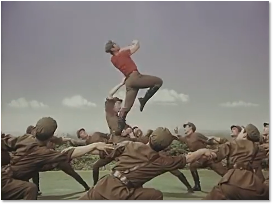 有趣的是,胶片并非被动记录,它悄然行使着选择的权力——它决定了后世的人们将以何种视角、何种景别来铭记《战马嘶鸣》。在镜头中定格下来的胶片拷贝,就此定义了经典的面貌。从舞台到胶片,作品完成了一次关键的媒介化转身,从一场限时演出,变身为一个时代的文化符号。这使军艺精神在没有数字媒体的时代,得以广泛流传和保存。