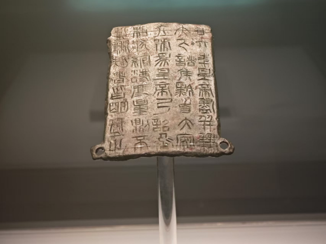 “镇原县博物馆的镇馆之宝是秦二十六年铜诏版,1976年 4月 1日被镇原县城关镇富坪村建宅取土的农民发现并上交。在1996年 9月,国家文物局鉴定专家组定为国家一级文物。这块铜诏版上有文字5 行,共40字,字迹清晰,线条纤细,字体为小篆。在用笔结构上既有秦代小篆规矩整饬的风范,又保留着大篆文字的某些特点。”镇远县博物馆讲解员介绍道。