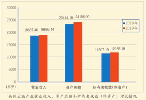 国家新闻出版署日前发布《2019年新闻出版产业分析报告》《2019年全国新闻出版业基本情况》。数据显示,2019年,新闻出版产业规模继续增长。全国出版、印刷和发行服务实现营业收入18896.1亿元,较2018年增长1.1%;拥有资产总额24106.9亿元,增长3.0%;所有者权益(净资产)12156.2亿元,增长3.0%。