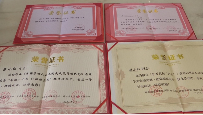 一分耕耘,一分收获,机会总给有心人。如今,张小红加入了靖远县作家协会、白银市作家协会、白银市文艺评论家协会成为了会员,也增选为靖远县政协委员。她的作品散见于《白银文学》《乌兰》等报刊杂志以及“靖远作协”“陇上风情”“黄土情文学”等文学公众号;部分作品荣获靖远县建党100周年“学党史颂党恩·述成绩谋发展”征文二等奖,“喜迎二十大·教坛著华章”《未来导报》有奖征文优秀奖等……