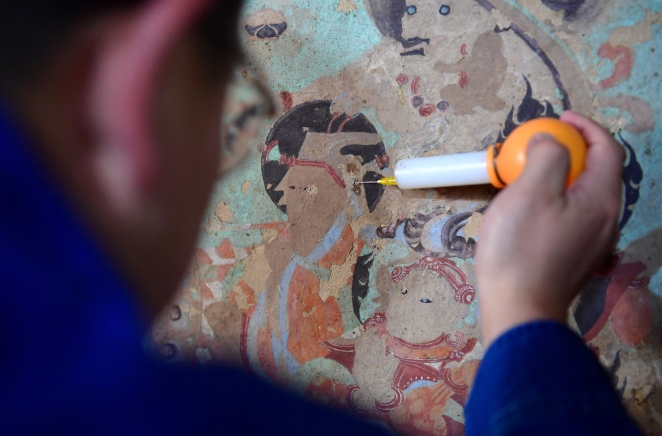 工作人员在修复出现病害的壁画。记者 杜哲宇 摄
